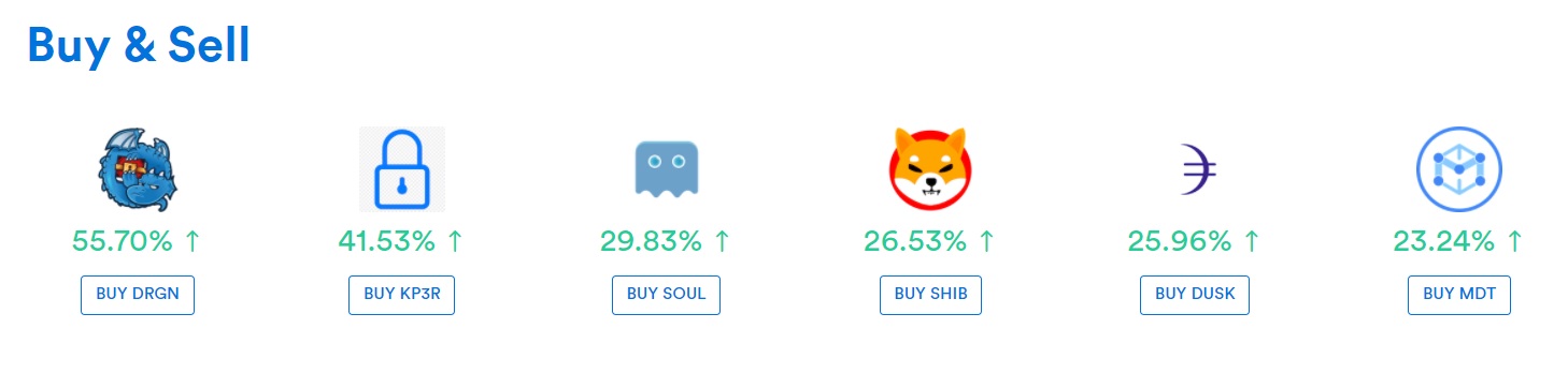 All the major features can be accessed with just the click of a button—for example, you can click the “Wallet” tab to instantly see your portfolio. The platform's landing page shows the top coin gainers for the day, letting customers quickly buy and sell these assets after login.